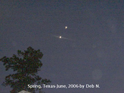 2006-Spring, Texas-06-04-06- I have attached two photos here that are very interesting. The first one I have lightened up a bit because it was really dark, a picture of the night sky. I was taking a picture of the moon and saw this image on my photo after I had taken it. Now I saw nothing or heard nothing. This to me looks like maybe a military aircraft of some kind. The question is why didn't I hear it and why didn't I see it? Is it ours or NOT ours? There was no sound or lights what so ever. I only saw the moon in a pitch black sky. So is this a spy plane of some kind? You be the judge. All I know is that it is very interesting to see something that is in our night sky over our homes that has no lights or sound and can fly at a very high altitude. source: www.ufocasebook.com, © Deb Newman