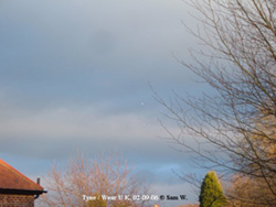 2006-February 9. Tyne/ Wear- U K. On the 9th of February 2006 at 4 PM I was looking out of the window of my home in the Tyne and Wear area of the North East of England, when I saw at least 20 glowing objects come out of the sky. I saw around 15 of the objects proceed back into the clouds and I got my camera. I quickly opened the window and was able to take a picture of the 5 remaining objects. I then saw 5 more come across the sky so I took a picture of them and then yet again 4 more came across the sky and I got yet another picture. The objects stopped coming so I went outside to investigate. I walked to the area in which the UFOs were flying over and one of the UFOs flew directly over my head and then proceeded into a cloud. I waited for quite while then went back home because I had not seen any more objects. © Sam W.