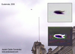 2006-Guatemala-A photograph taken by Jeysen Caban Fernandez, taken during the Good Friday processions (14 April 2006) in the Central Square of Antigua, Guatemala. "When I took the photos with my digital camera I didn't see anything, but when I downloaded them to the computer, I was able to see this object in the sky, which is very close to the Volcan de Agua volcano that borders the city. I consulted this with other people and we believe it cannot represent either a plane or a bird."Jeysen is a native of Puerto Rico. He employed a Kodak EasyShare CX-7300 camera with normal exposure times. source-www.analuisacid.com