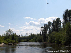 2006-Jackfish Creek, Alberta, Canada-July 3-I saw a beam of light and I have 2 photos. The first, is a photo of Jackfish bridge with a disk shaped object, and a beam of light just missing it. The object has a bright area on top of it, almost like a cloud and a possible contrail or object trailing behind it. It's almost like a dragonfly captured in a digital image, but I don't think it is. source: www. hbccufo.com