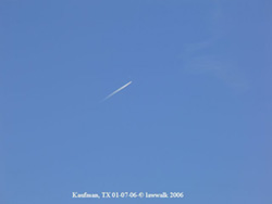 2006-Kaufman, Texas The ufo picture is on the right of the picture, the picture in larger size has been magnified beside it. This one was taken on 01-24-2006 approximately 5:30pm. I was taking photos of this small plane because it was travelling fairly fast and I couldn't make it out too good through the viewfinder and thought it may not be a plane. I took about five photos of it and this object was in just one of them. If it was another plane or bird, it should have been in two or three of them at least, but it wasn't. So I'm thinking it could be something else. I'm sending you also a copy of the original for your analysis. © lawwalk 2006