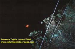 2006-March 10-A chance photograph of a UFO has been taken in Orizaba by Rossana Tejeda Lopez. The photograph was taken at night on March, 10, when the Moon was bright. Rossana filmed the UFO from her garage. Her first photo there is a very luminous, orange-colored object. The second photo does not show an object, but the third one does. There was nothing unusual seen by the photographer as she was snapping the photos. She was only trying to photograph the sky. © R T Lopez