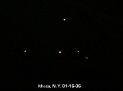 2006 Itchaca, New York-01-16-06-Great Ufo Picture. What was unusual about this group of lights was that the colors were a pale yellow, stationary. and very low above the hills in front of me. I quickly retrieved my Olympus C-740 Zoom digital camera from my office. The object was still not moving when I returned and seemed to be of incredible size, like two 747 jets placed together nose to tail. How was it possible that an object this large could stay in the sky, was my first thought. I placed the lens right up against the glass so as not to get any reflection and took three shots. That is when the object began to move very slowly towards the North heading over Cuyuga Lake. original source: http://www.hbccufo.org